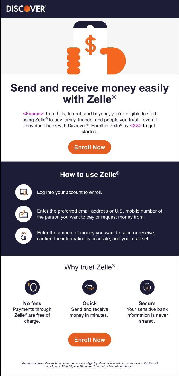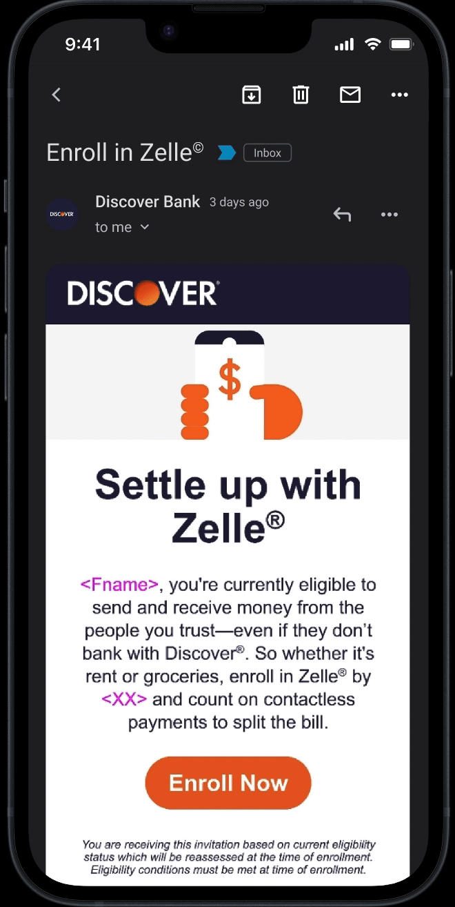 To encourage more app users to enroll in Zelle, we designed an animated marquee showcasing how quick and effortless it is to send money with just a tap.