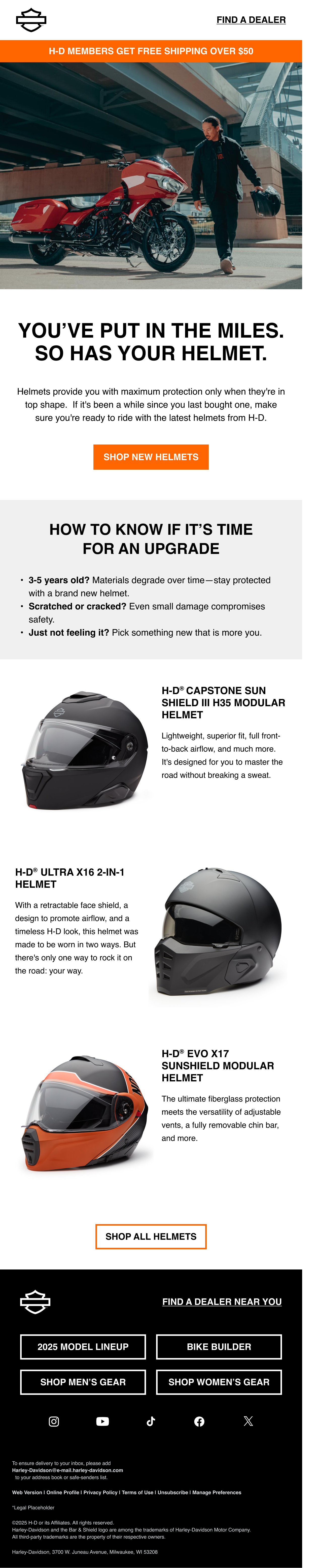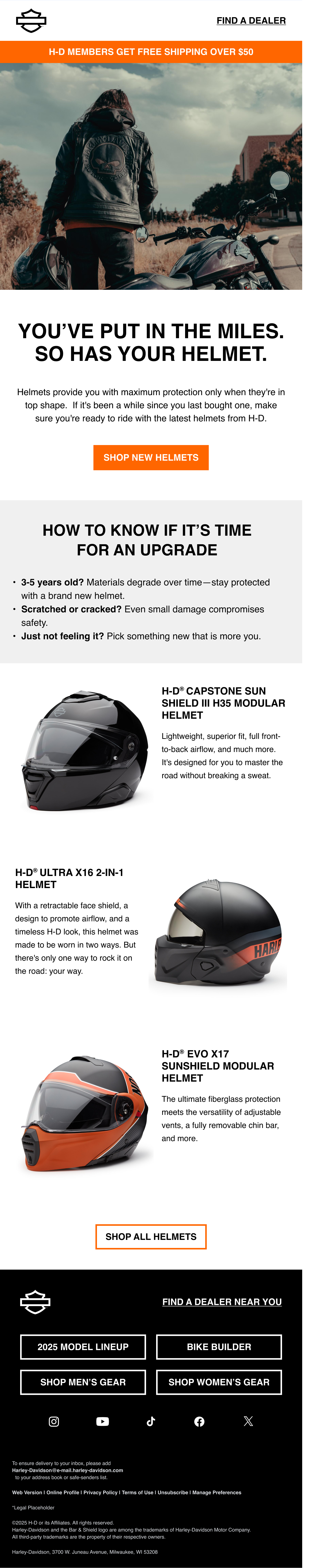 We redesigned the email layout to align with H-D’s Model Year 2025 brand guidelines, featuring a white background and a bold, all-caps black headline for retail bike emails, membership newsletters, and VISA acquisition emails.